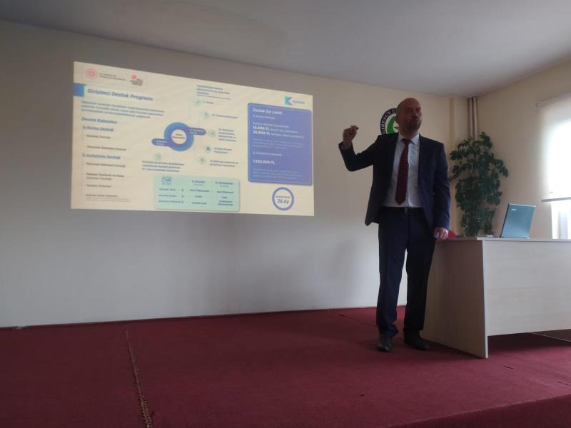 “Girişimcilik” dersi kapsamında Bulancak Kadir Karabaş Uygulamalı Bilimler Yüksekokulu öğrencilerine yönelik KOSGEB Giresun Müdürlüğü'nden, KOBİ Uzmanı Sayın Dr. Kutay ŞENEL tarafından girişimcilik destekleri hakkında bilgilendirme yapıldı. Söyleşi kapsamında, KOSGEB Müdürü Sayın Yasin SEFER öğrencilere, iş fikri ve proje geliştirme konularında bilgi vererek özellikle gençlerin iş dünyasına daha donanımlı bir şekilde adım atmaları gerektiğini ifade ederek girişimcilik kültürü kapsamında iş fikri, finansal okuryazarlık, yönetim ve dijital pazarlama gibi alanlarda eğitimler alarak kendilerini geliştirmeleri gerektiğini ifade etti.