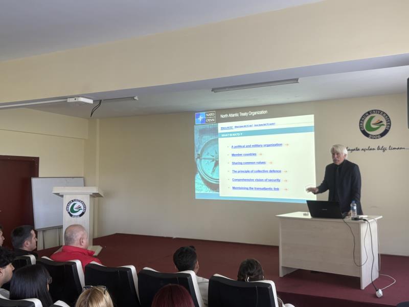 Uluslararası Ticaret ve Finansman Bölümü Öğretim Üyesi Prof. Dr. Sadettin GÜLTEKİN tarafından 13 Ekim 2025 Pazartesi günü saat: 11.00'da yüksekokul konferans salonunda "NATO'nun Türkiye Savunmasındaki Ekonomik ve Ticari Önemi" konulu konferans düzenlenmiştir. Konferansa Yüksekokul Müdürümüz Doç. Dr Oktay KARAMAN, müdür yardımcımız Doç. Dr. Arif ÇİLEK, Bölüm hocaları ile değerli öğrencilerimiz katılım sağlamış ve NATO çerçevesi bağlamında güvenlik şemsiyelerinin uluslararası ticaret ve ekonomi üzerindeki etkileri tartışılmıştır.